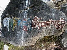 In Tibetan Buddhism, this is the most ubiquitous mantra and the most popular form of religious practice, performed by laypersons and monastics alike. It is also an ever present feature of the landscape, commonly carved onto rocks, known as mani stones, painted into the sides of hills or else it is written on prayer flags and prayer wheels