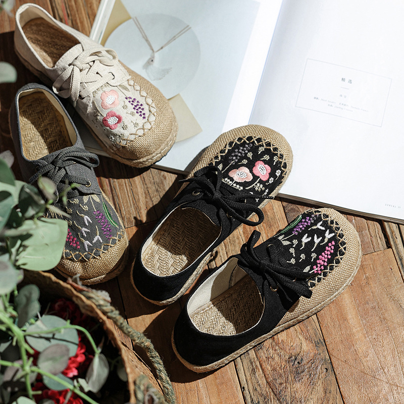 Leisure Lace Up Front Buckle Round Head Women's Embroidered Shoes, Low Cut Flat Heel Cotton Linen Cloth Shoes, Spring and Summer Single Shoe