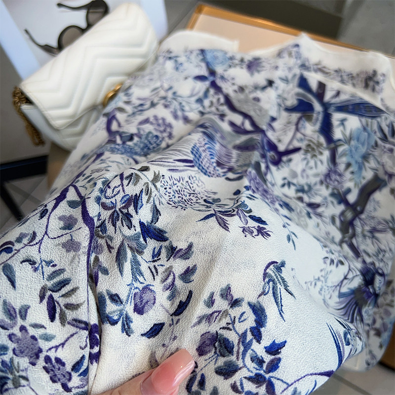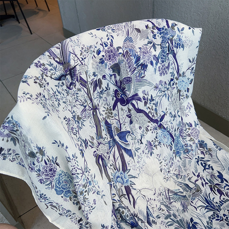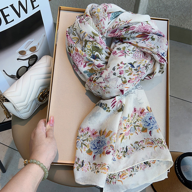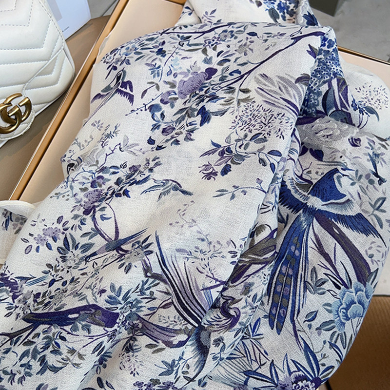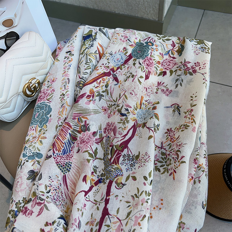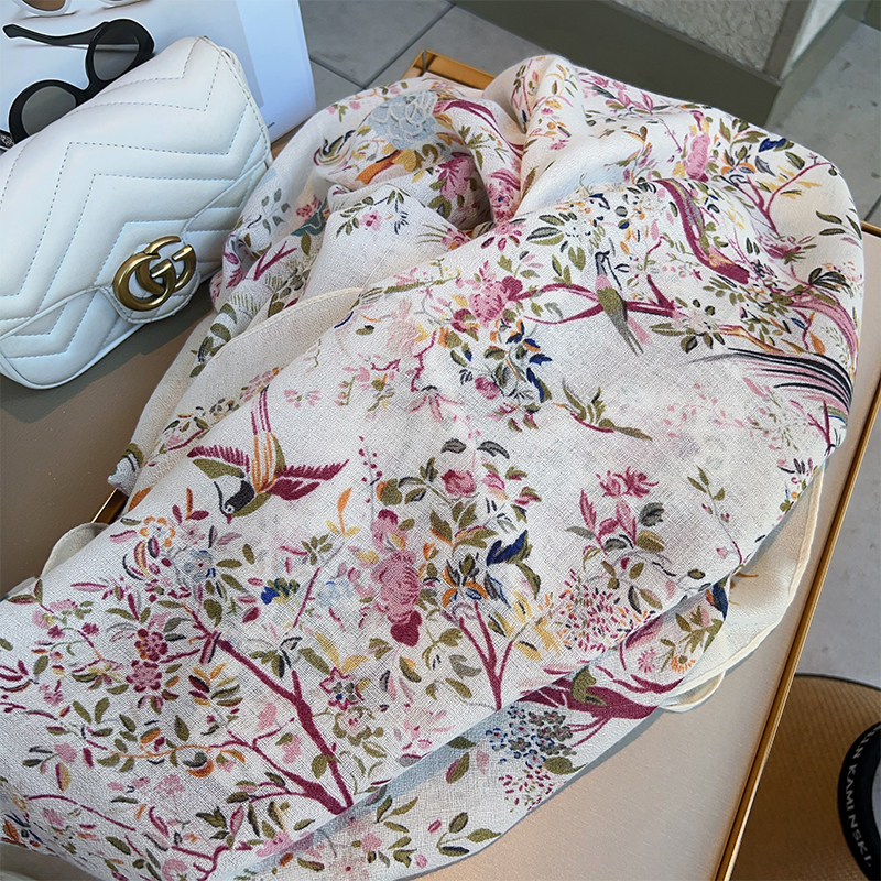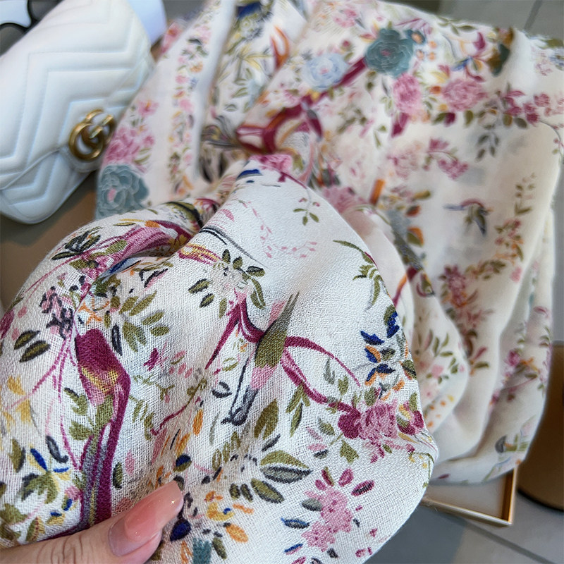 Cotton and Linen Scarf Female Original Design Birds and Flowers Pastoral Style Versatile Warm and Beautiful Neck Shawl Spring and Autumn New