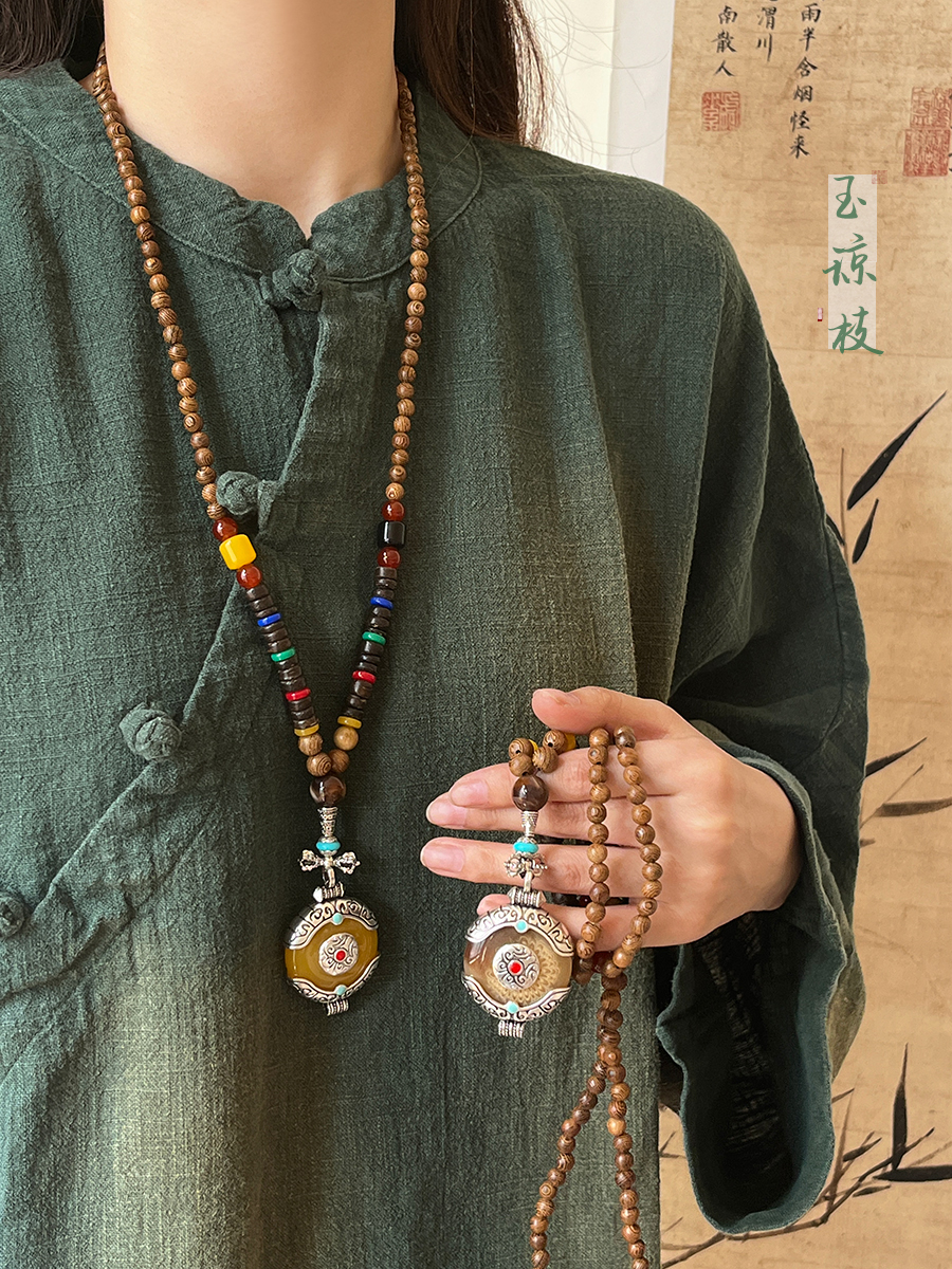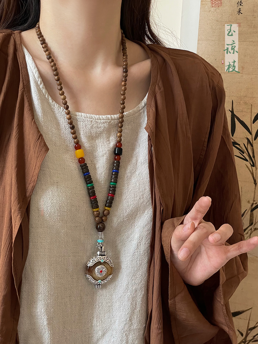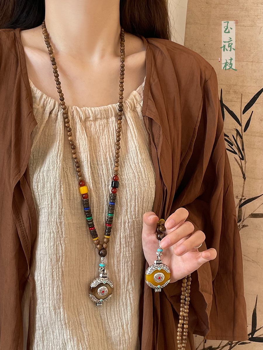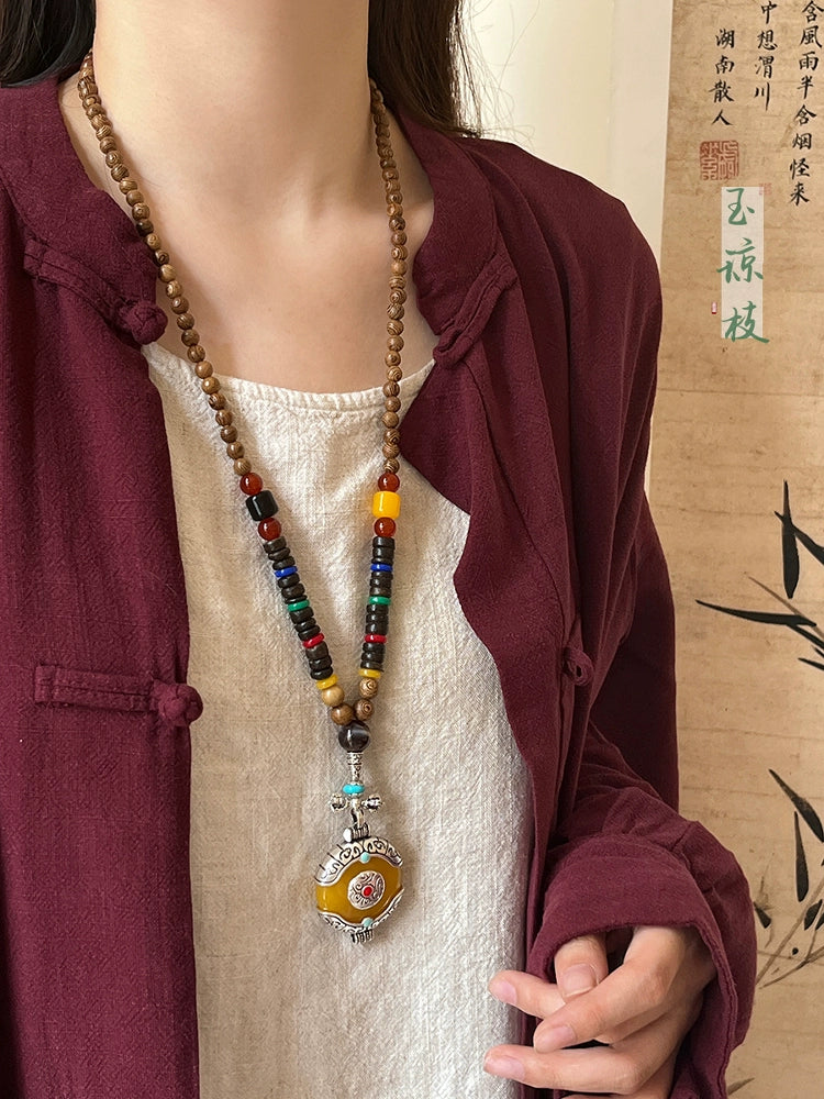 Ethnic Wood Buddha Bead Necklace Women's Tibetan Zen Retro Old Long Pendant Sweater Chain